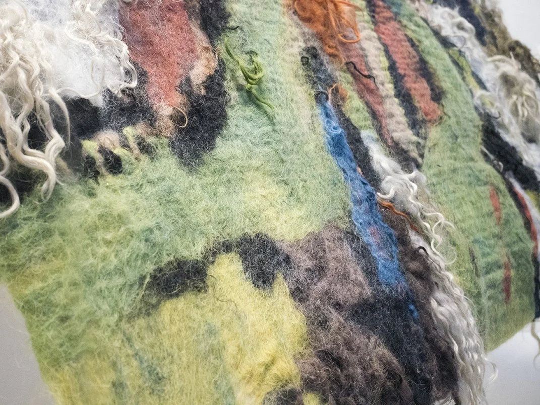 The colors of the work Coreopsis C(h)amp were partly grown in my garden. The orange comes from the flower coreopsis and is the central actor among the dyes. Opposite her is a wasabi green, which, although not derived from this plant but from indigo and reseda, has inspired root-like forms. The colors line up, overlap, and have a tactile quality. Their surfaces are animated by the curly wool that drapes around botanical forms and patterns. The felted textile forms a bridge between the architecture of the display window of wunderkammer-naturalia-artificialia and the field where the plants grew and the sheep grassed. It is changing the interior architecture of the space.