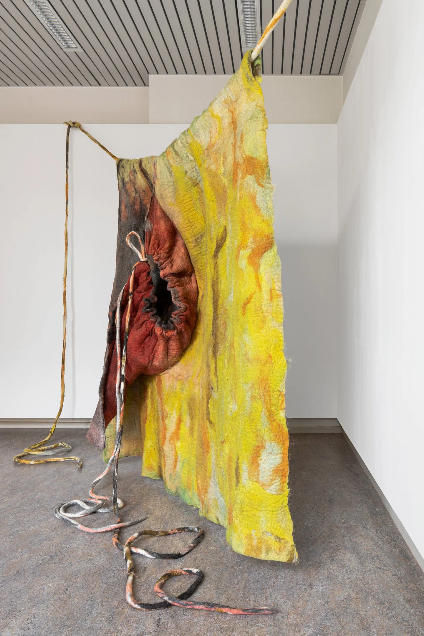 The sculpture is created using vibrant yellows, oranges, and greens from various flowers, alongside the rich reds of madder roots, all applied to the wool according to their harvest seasons. These colors blend and stain each other in certain areas, reflecting the natural overlap of growth cycles. Felt Time not only reflects the temporal qualities of the wool and plants used but also responds to the environments in which it is displayed, evolving through both interaction and location.